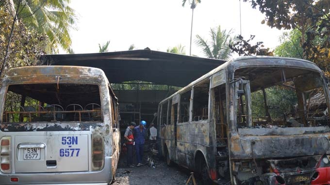 Đám cháy kéo dài 15 phút nhưng đã thiêu rụi hoàn toàn xe buýt, xe khách và 2 xe máy.