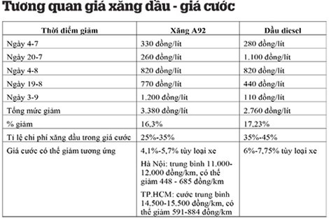 Cũng theo vị này, một số hãng xe taxi (như Vinataxi) đã tăng cước 500 đồng/km thì nay đã giảm giá cùng giá tăng ấy và xem như về lại giá cước ban đầu (trong khi giá xăng cao hơn). Với DN chưa giảm, như hãng xe taxi Mai Linh từng tăng 500 đồng/km thì Sở Tài chính đã nhắc, và hãng xe này cũng cam kết sẽ giảm cước taxi trước ngày 10/9.
