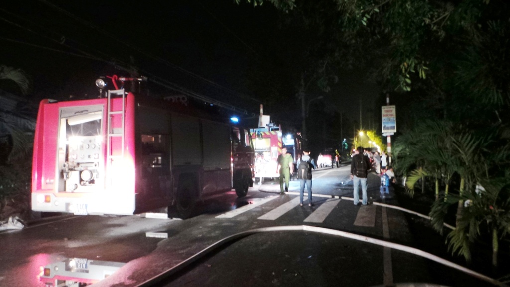 | Cảnh sát PCCC huyện Bình Chánh huy động 8 xe chuyên dụng cùng 56 chiến sĩ đến hiện trường. Sau 30 phút chữa cháy, ngọn lửa cơ bản được khống chế. |