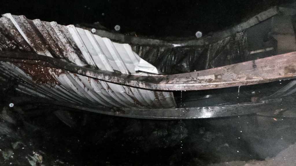 | Toàn bộ nhà kho chứa nguyên liệu rộng hàng trăm mét vuông và nhiều máy móc bị thiêu rụi, tường và mái tôn đổ sập. |