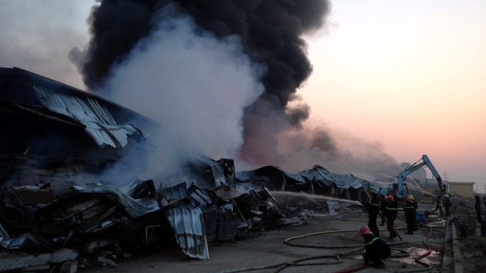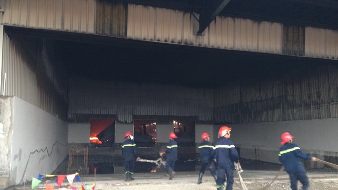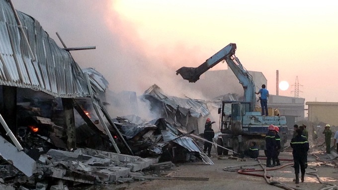 | Đến 17h, ghi nhận tại hiện trường đám cháy đã làm sập toàn bộ khu nhà xưởng. |