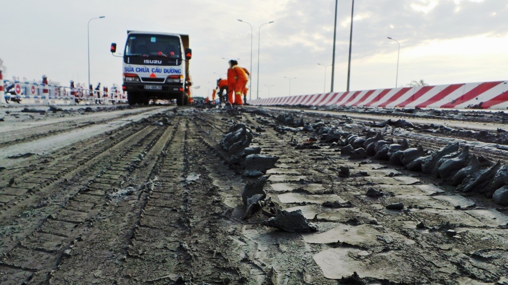 | Theo người dân, rạng sáng cùng ngày, trên làn đường ôtô của cầu Rạch Cây xuất hiện rất nhiều bùn nhão, trơn trượt dài hơn 50 m. |