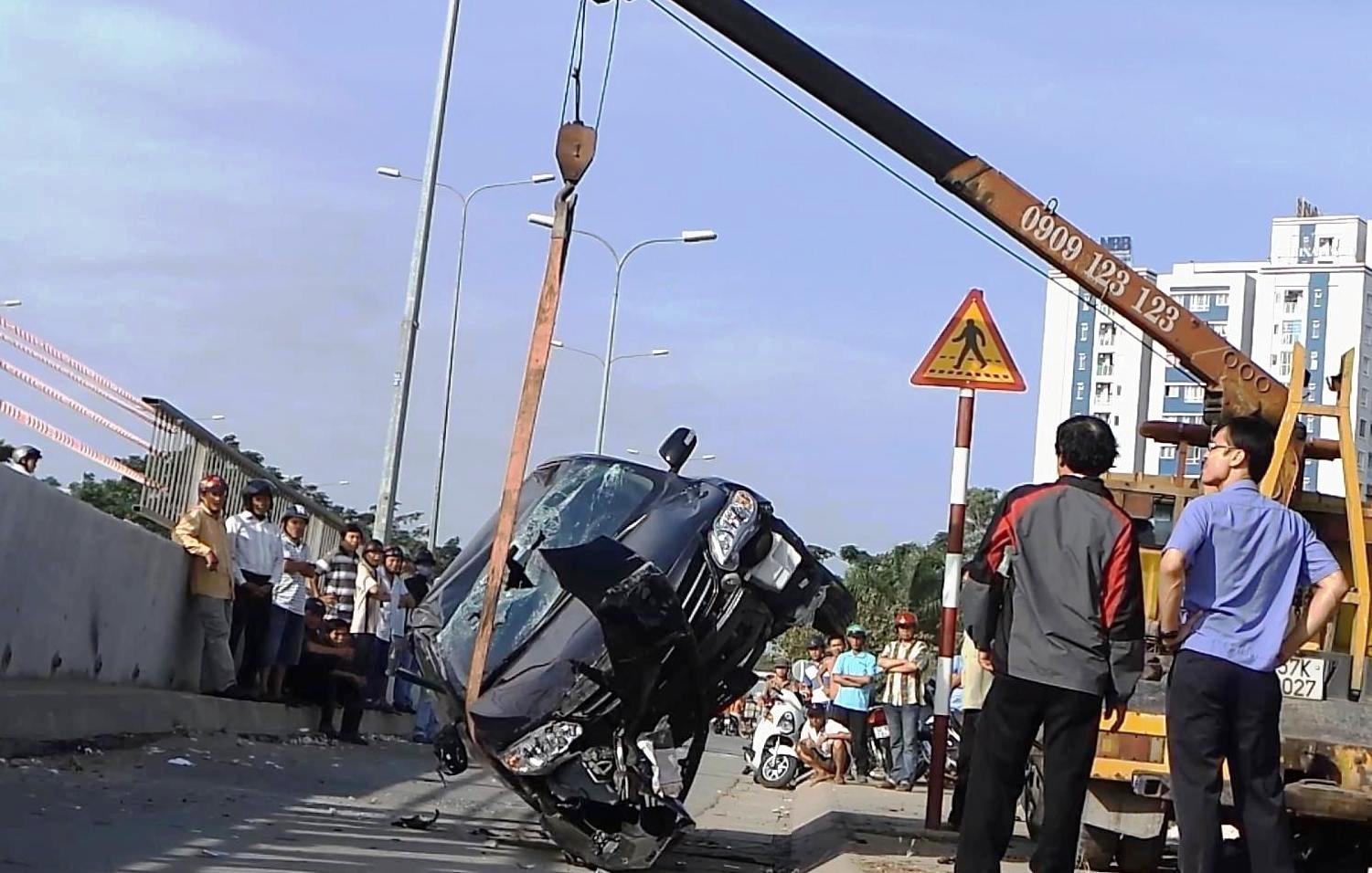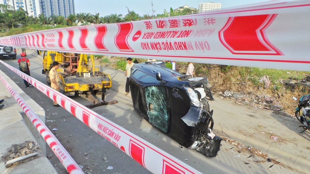 | Chiếc xe lao qua dải phân cách, tông văng 5 m lan can rồi bay xuống cầu có độ cao gần 2 m |
