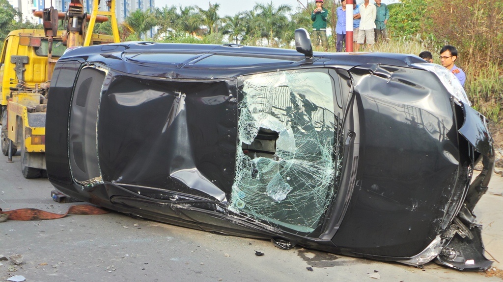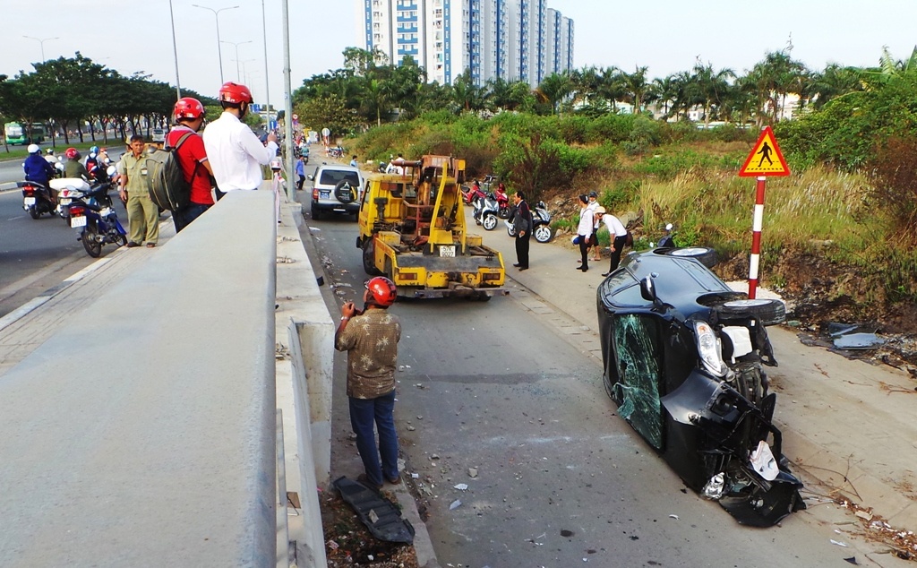 | Khi "đáp" xuống đường bên hông cầu, chiếc xe bị lật nghiêng, hư hỏng nặng. Tài xế Diện may mắn bị thương nhẹ. |