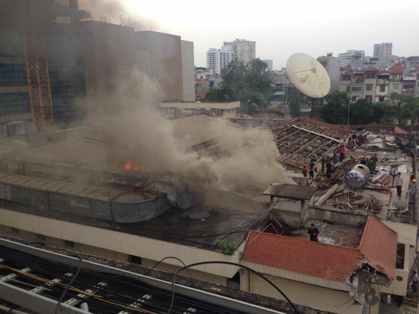 | Theo một số người chứng kiến, vụ cháy xảy ra khi các công nhân đang hàn, cắt để tháo dỡ phần mái. Do khu vực phát hỏa có nhiều vật liệu cách âm nên ngọn lửa đồng thời tạo nên lượng khói lớn. |