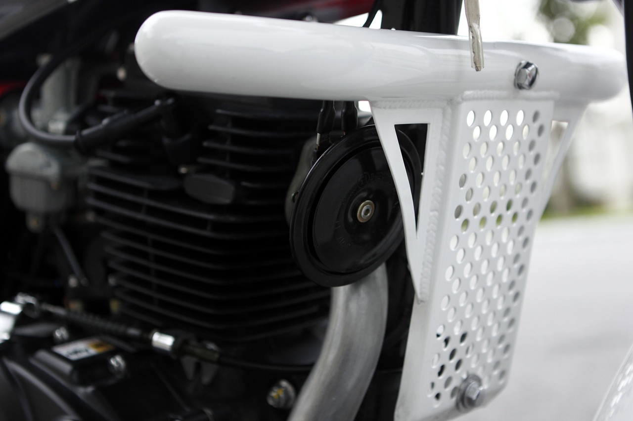 Toàn bộ cụm động cơ được khoe trọn vẹn khi không có dàn vỏ bên ngoài. Điểm nhấn của khu vực này chính là bộ khung bảo vệ máy khá lạ, khiến cho tổng thể của xe trở nên khác biệt với những mẫu xe máy lưu thông trên đường.