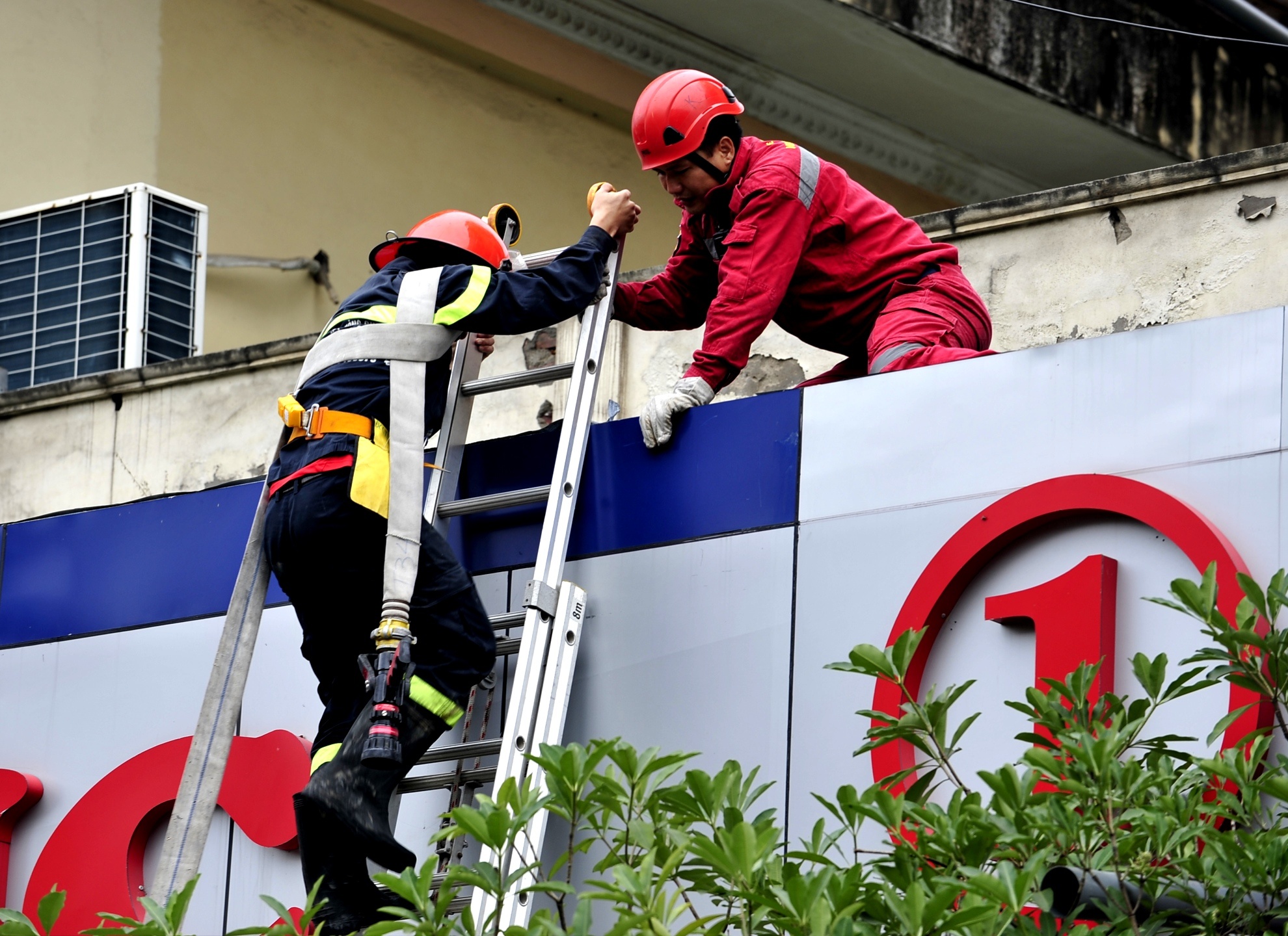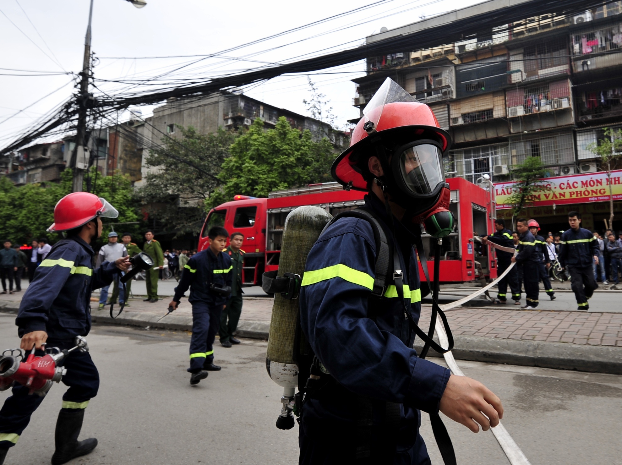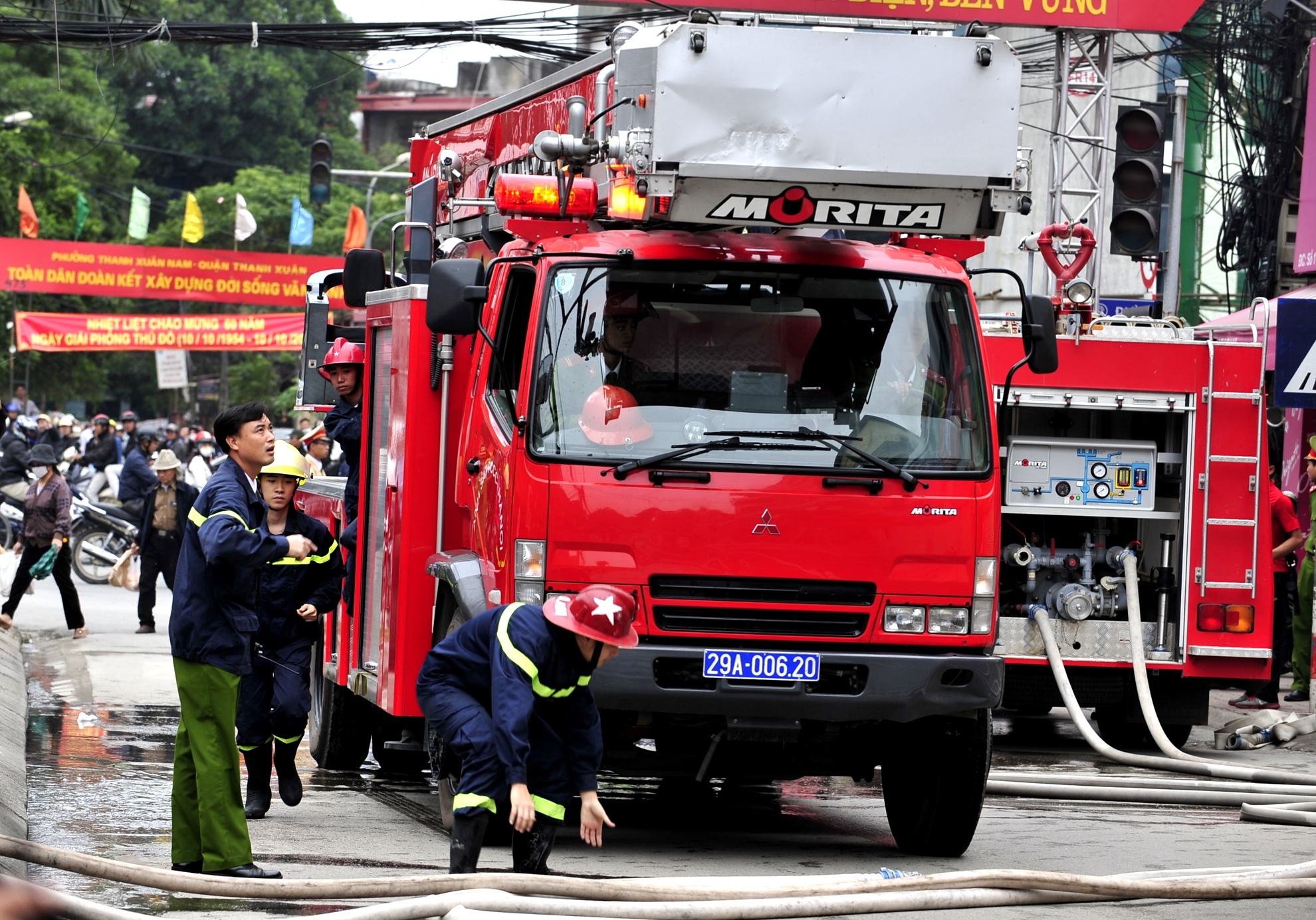 9h50, 6 xe cảnh sát PCCC có mặt trong đó đã điều xe thang của đội Đống Đa.