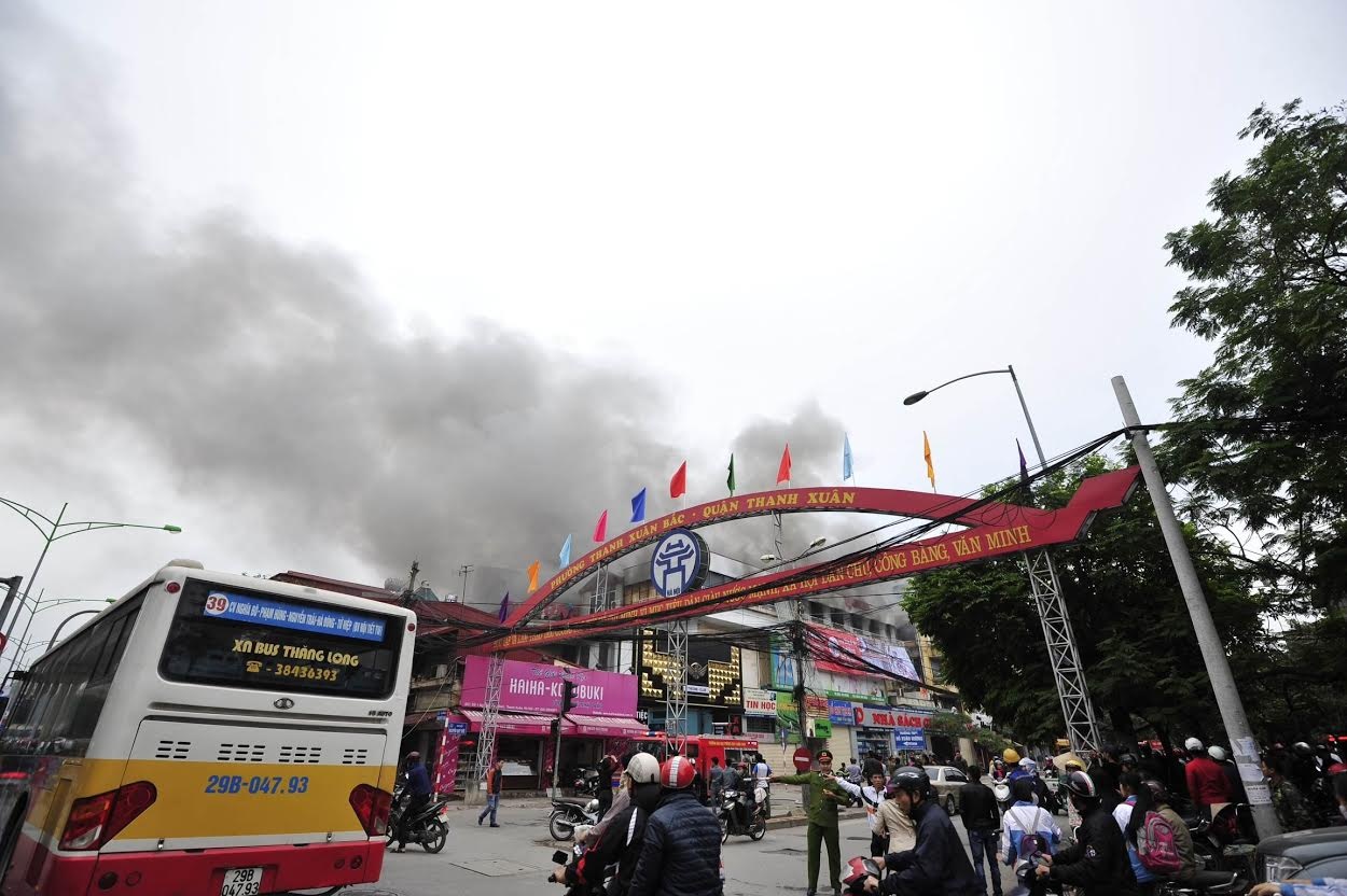 Tòa nhà 3 tầng có sàn khiêu vũ, quán cà phê ở quận Thanh Xuân (Hà Nội) phát cháy lúc 9h sáng. Khói đen bốc cao hàng chục mét.