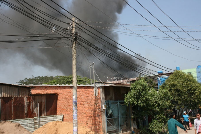 | Nhìn từ xa có thể thấy cột khói rất cao. Đến gần 15h, ngọn lửa được dập tắt hoàn toàn, tuy không có thiệt hại gì về người nhưng nhà xưởng Thiên Ân gần như sụp đổ hoàn toàn. |