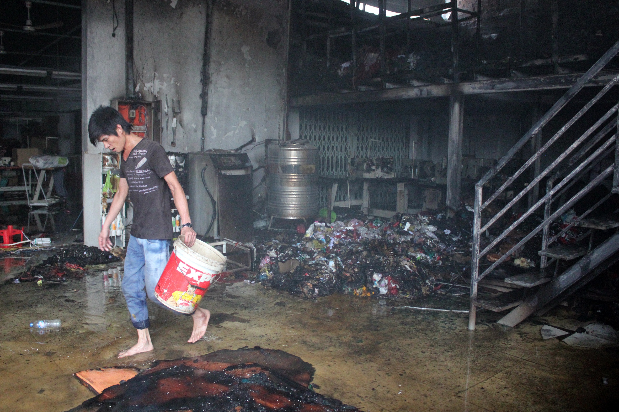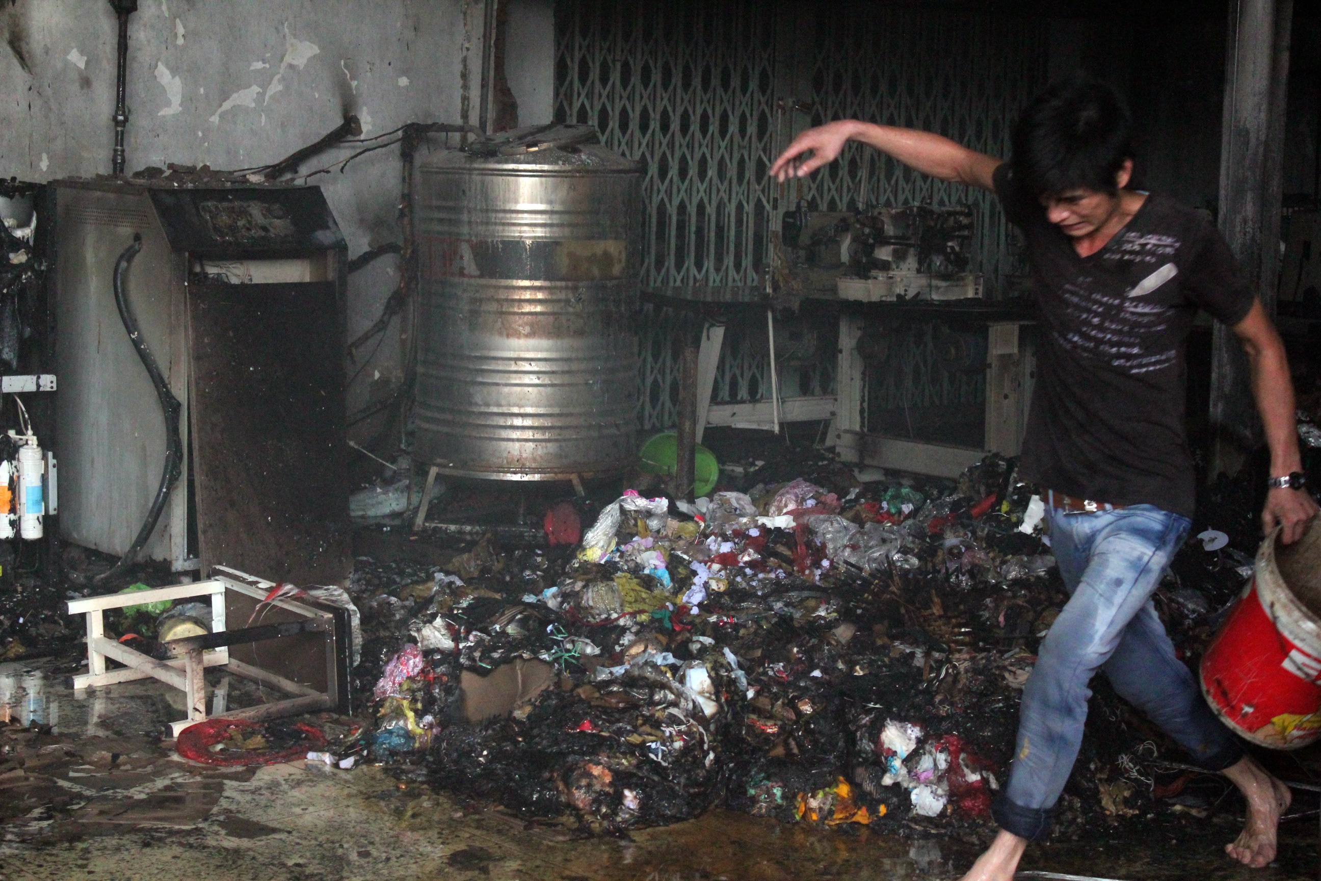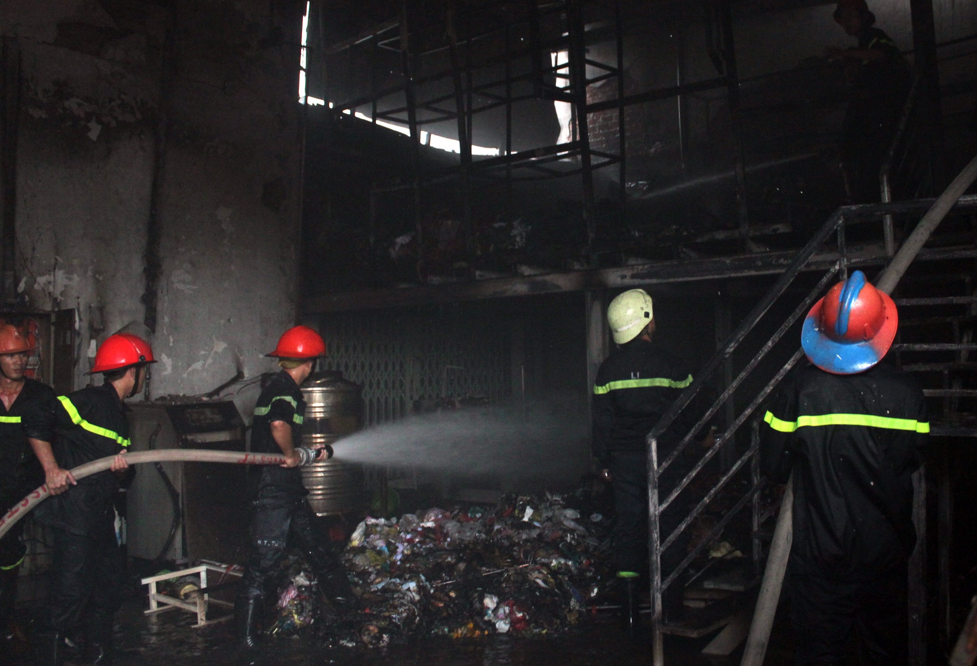 | Sau khi đám cháy được khống chế, các công nhân công ty tiếp tục dội nước để làm nguội máy móc và tiến hành dọn dẹp đồ đạc, hàng hóa bị cháy. |