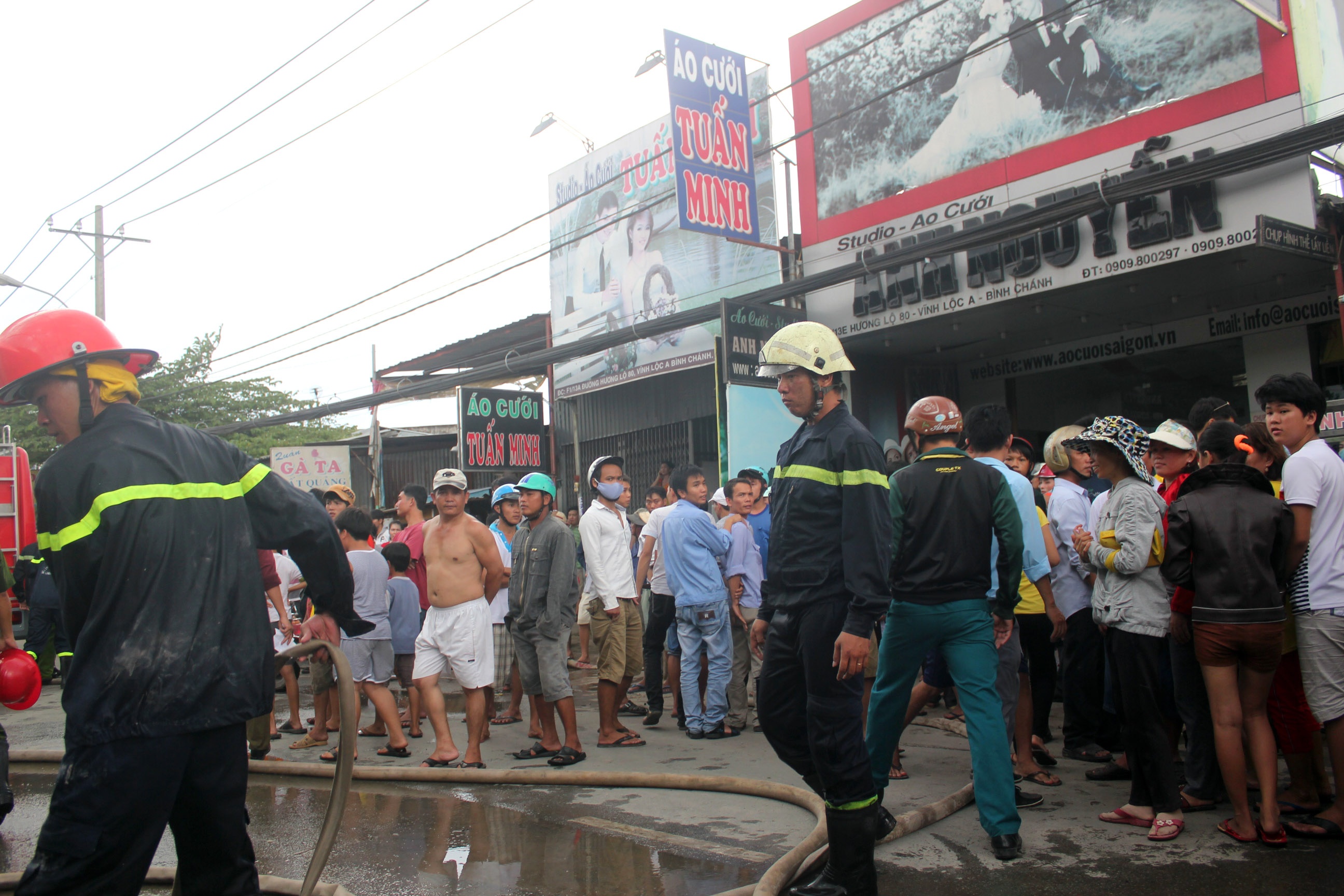 | Bên ngoài đường Vĩnh Lộc, rất đông người dân và người đi đường chen chúc nhau xem vụ cháy. Đoạn đường này bị phong tỏa để lực lượng PCCC tiến hành dập lửa. |