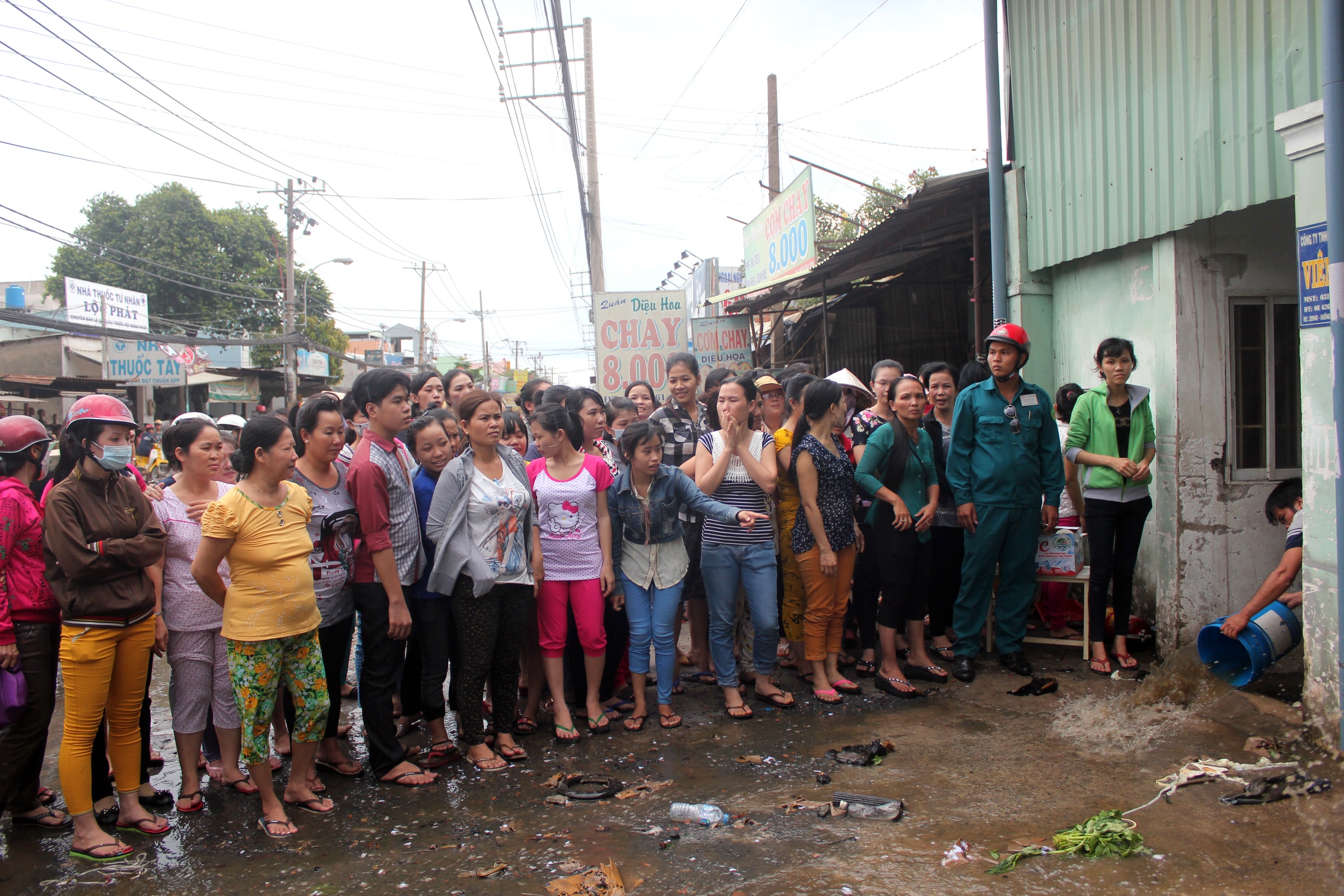 | Những nữ công nhân của công ty chứng kiến vụ cháy xưởng may vẫn chưa hết bàng hoàng, đứng chờ để kiểm tra lại đồ cá nhân khi chưa kịp mang theo khi chạy ra ngoài. |