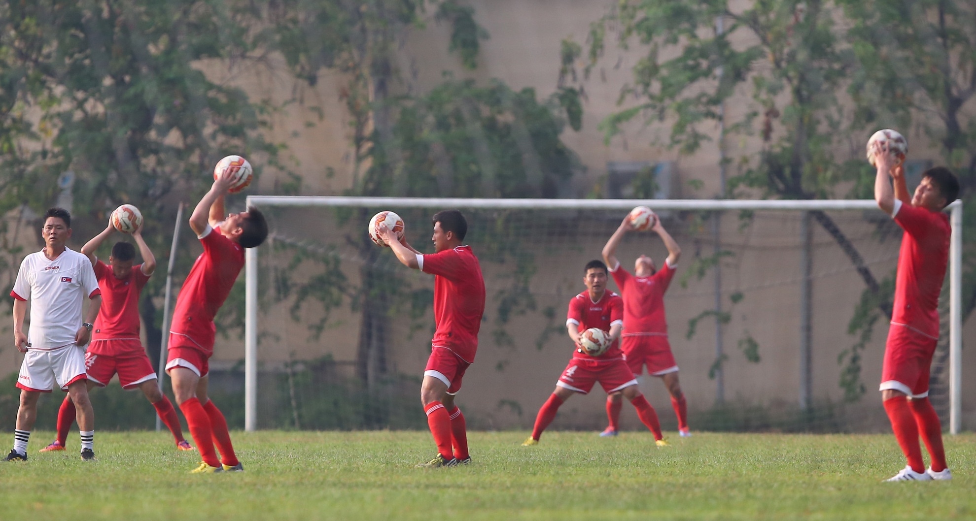 | Bài tập khởi động của đội bóng được mệnh danh "bí ẩn nhất thế giới". Các phóng viên chỉ kịp ghi hình trong 1-2 phút trước khi nhận được yêu cầu tập kín từ lãnh đạo đội Triều Tiên. |