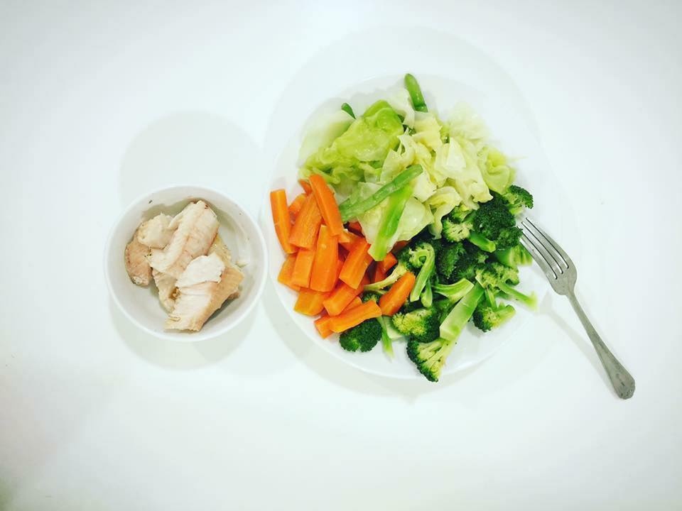 | Người đẹp lựa chọn chế độ dinh dưỡng không tinh bột, dầu mỡ, bổ sung nhiều rau xanh, hoa quả và thức ăn giàu protein. Trong hình, Phạm Hương lựa chọn cá, cà rốt, súp lơ xanh, bắp cải cho bữa chính. |