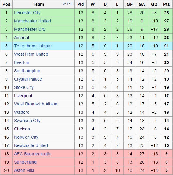 | Cập nhật bảng xếp hạng vòng 13 Premier League. |