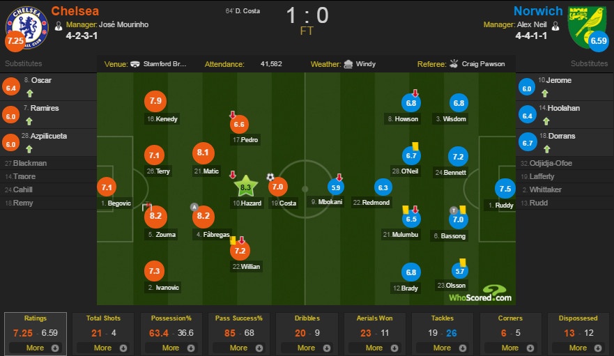 Song trước hàng thủ được tổ chức tốt và chơi với số đông của đội khách, The Blues cũng phải chờ tới phút 64 mới tìm được bàn thắng khai thông thế bế tắc. Từ pha đá phạt nhanh của Fabregas, Costa băng xuống tỉnh táo loại bỏ một hậu vệ đội khách trước khi tung ra cú cứa lòng lạnh lùng hạ gục thủ thành Ruddy. Đây cũng là pha lập công đầu tiên của tiền đạo người Tây Ban Nha sau 6 trận liên tiếp tịt ngòi.