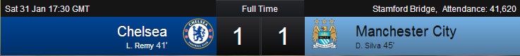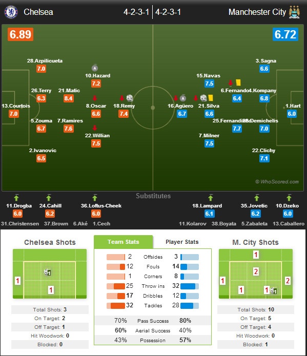 Phải hành quân tới Stamford Bridge nhưng trong tâm thế của kẻ bám đuổi, Man City chấp nhận nhập cuộc bằng lối chơi tấn công. Cộng thêm sự quyết tâm, đoàn quân của HLV Pellegrini tạo ra thế trận lấn lướt trong suốt cả hai hiệp đấu. Tuy nhiên, trước phong cách phòng ngự thực dụng đậm chất Mourinho, nhà đương kim vô địch vẫn chỉ có thể ra về với 1 điểm trong tay.