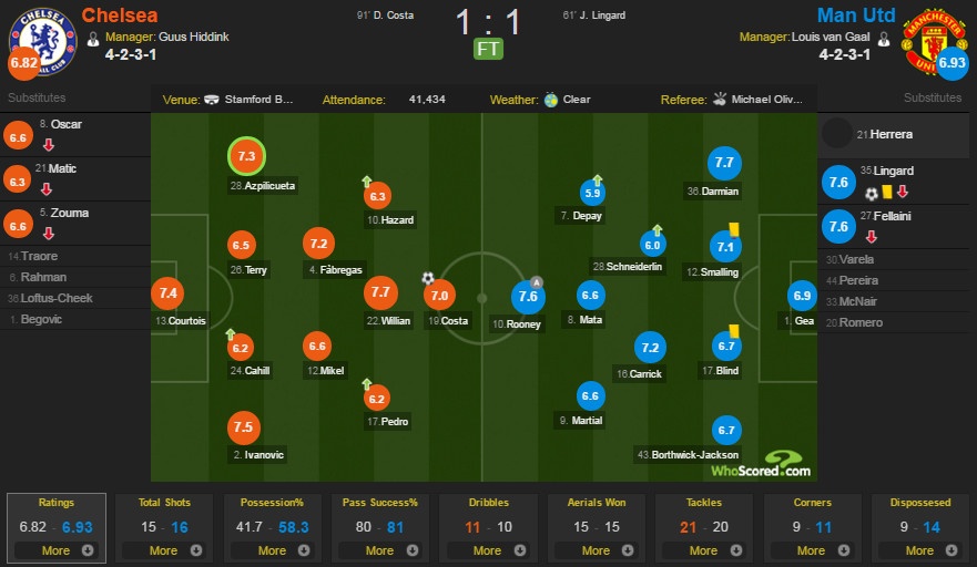 Tưởng như huấn luyện viên Louis van Gaal sẽ lập công giúp Quỷ đỏ phá dớp không thắng trước The Blues ở 9 lần đối đầu gần nhất khi Jesse Lingard xoay người dứt điểm đẹp mắt mở tỷ số cho đội khách ở phút 61. Nhưng đúng phút bù giờ đầu tiên, chỉ một thoáng sơ hở của hàng thủ đã khiến Manchester Utd phải trả giá. Diego Costa bất ngờ thoát xuống, may mắn nhận sự trợ giúp từ cú xoạc bóng bất thành của Borthwick-Jackson để vượt qua cả De Gea trước khi dứt điểm vào lưới trống.