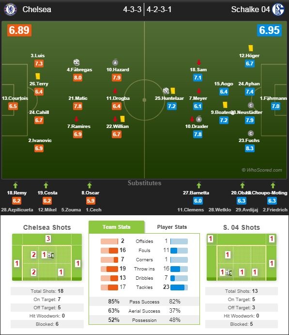 Drogba không thể tỏa sáng nhưng Chelsea vẫn rất mạnh với những cá nhân xuất chúng khác. Sức mạnh của đội chủ nhà được cụ thể hóa bằng bàn thắng ở ngay phút 11 của Cesc Fabregas sau pha phối hợp ăn ý với Eden Hazard. Có được lợi thế từ rất sớm, The Blues dễ dàng kiểm soát thế trận với lối chơi rất chủ động. Những pha bóng nguy hiểm mà Schalke tạo ra chủ yếu đến từ một vài cú sút xa uy lực của Kevin-Prince Boateng.