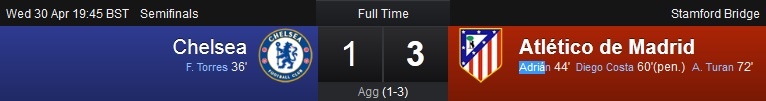 Thua chung cuộc 1-3 sau hai lượt trận, Chelsea đành ngậm ngùi nhìn Atletico vào chung kết. Đây là lần thứ 2 trong lịch sử, Los Rojiblancos có mặt ở trận đấu cuối cùng (trước đó ở mùa 1973/74 và thua Bayern Munich). Ở trận chung kết diễn ra tại Lisbon ngày 24/5 tới, thầy trò HLV Diego Simeone sẽ chạm trán kình địch cùng thành phố, Real Madrid, đội vừa vùi dập Bayern 4-0 ngay trên đất Đức.