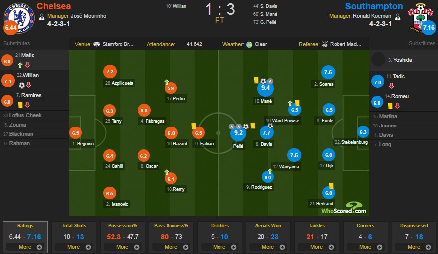 76': Suýt chút nữa đã có bàn thua thứ 4 cho Chelsea. Mane dùng tốc độ vượt qua Cahill trước khi chuyền vào thuận lợi cho Tadic nhưng pha dứt điểm sau đó của tiền vệ đội khách lại bị Terry cản phá đi hết biên ngang.