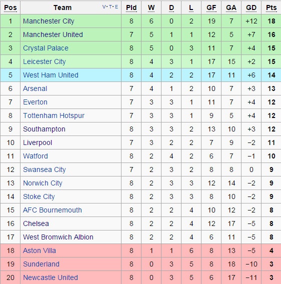 | Bảng xếp hạng cập nhật vòng 8 Premier League. |