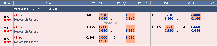 | Tỷ lệ trận đấu tính đến phút thứ 7. Với tỷ lệ này, Chelsea được đánh giá cao với một trận thắng cách biệt 2 bàn. |