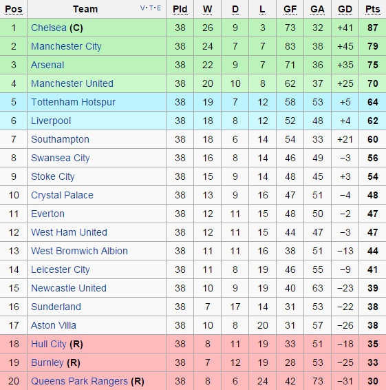| Bảng xếp hạng Premier League mùa giải 2014/15. |