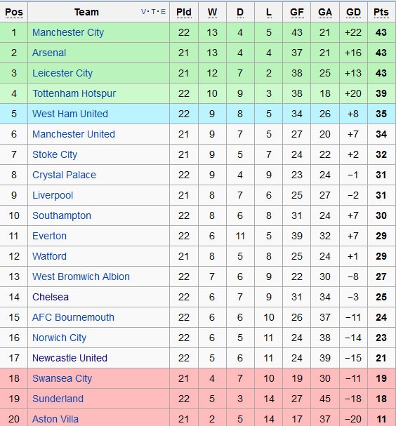 | Bảng xếp hạng Premier League sau khi kết thúc các trận đấu sớm ở vòng 22. |