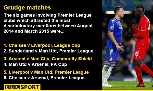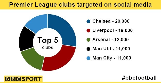 Trong 134.400 phát ngôn đả kích, có 95.000 câu nhắm vào 20 CLB Ngoại hạng Anh. Chelsea là đội bóng bị đả kích nhiều nhất với con số 20.000 tính từ tháng 8/2014 đến hết tháng 3/2015. Đứng thứ 2 là Liverpool với 19.000. Trong Top 5 đội bị dè bỉu còn có Arsenal (12.000), Manchester United (11.000) và Man City (11.000).