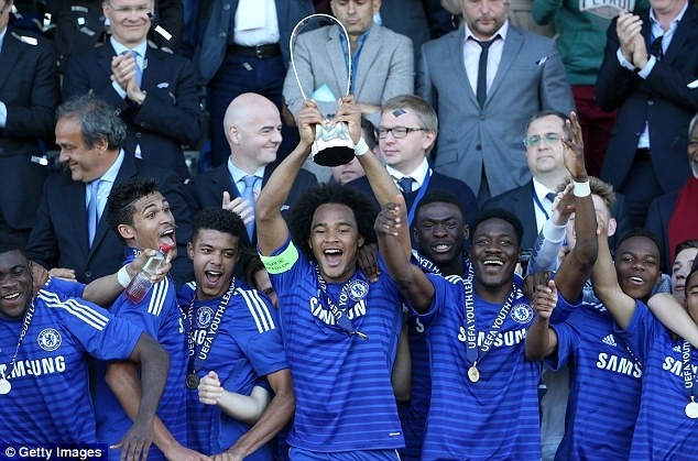 | Đội trưởng Izzy Brown (giơ Cúp) là người hùng của trận chung kết UEFA Youth League diễn ra tại Nyon, Thụy Sỹ. Tiền đạo 18 tuổi người Anh lập cú đúp, góp phần vào chiến thắng 3-2 của "Lữ đoàn xanh". |