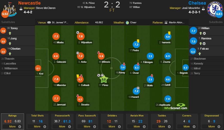 Để Newcastle dẫn trước 2 bàn, Chelsea vùng lên tấn công mạnh mẽ. Tuy nhiên, The Blues tỏ ra bế tắc trước hàng thủ số đông và được tổ chức rất tốt của đội chủ nhà. Mọi chuyện chỉ trở nên sáng sủa hơn với đội khách khi huấn luyện viên Jose Mourinho lần lượt đưa Willian, Ramires và Falcao vào sân thay Oscar, Remy và Matic chơi mờ nhạt.