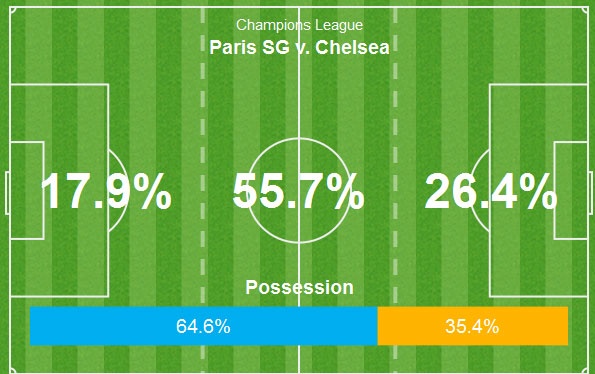 | PSG vượt trội Chelsea về tỷ lệ kiểm soát bóng. Họ có 20 cú sút, trong khi "The Blues" thực hiện 10 lần dứt điểm trong 90 phút. Đồ họa: Telegraph. |