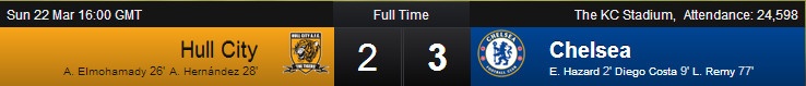 Trong những phút còn lại, Hull City đẩy cao đội hình tấn công nhưng không thể xuyên thủng hàng phòng ngự được tổ chức chặt chẽ hơn của đội khách. Chiến thắng nhọc nhằn 3-2 giúp Chelsea nới rộng khoảng cách với đội bóng xếp thứ 2, Man City lên thành 6 điểm.