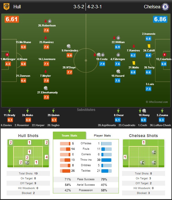 | Thống kê trận Hull City - Chelsea. Ảnh: Whoscored. |