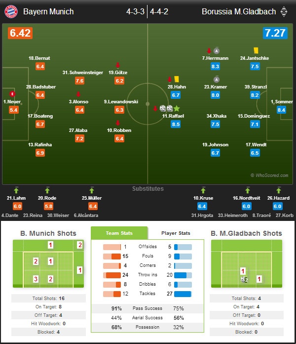 | Thống kê trận Bayern - Gladbach. Ảnh: Whoscored. |