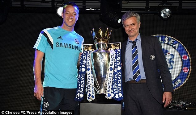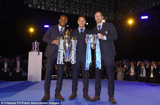 | Thủ quân John Terry cùng hai lão tướng Drogba và Petr Cech khoe cúp vô địch Ngoại hạng Anh và League Cup trong gala cuối năm của Chelsea. |