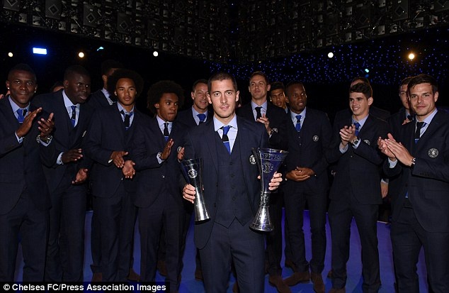| Tiền vệ Eden Hazard khoe giải thưởng cá nhân trong năm 2015. Anh là cầu thủ xuất sắc nhất Chelsea năm 2015. |