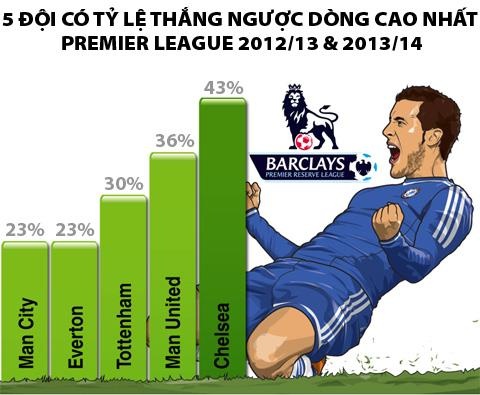 Thống kê chỉ ra Chelsea đang là vua ngược dòng tại giải đấu số một xứ sương mù. Mùa trước, họ thắng 46% số trận bị dẫn trước. Mùa này, con số tương tự là 40%. Như vậy, tính trung bình 2 mùa thì The Blues thắng 43% số trận họ bị sút tung lưới trước. Đội xếp sau Chelsea là M.U với 36%. Đáng chú ý, Sunderland - đối thủ của The Blues tối nay, chưa thắng trận nào khi bị dẫn trước mùa này.