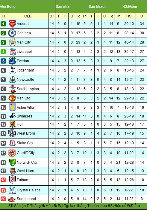 Bảng xếp hạng sau vòng 14 Ngoại hạng Anh