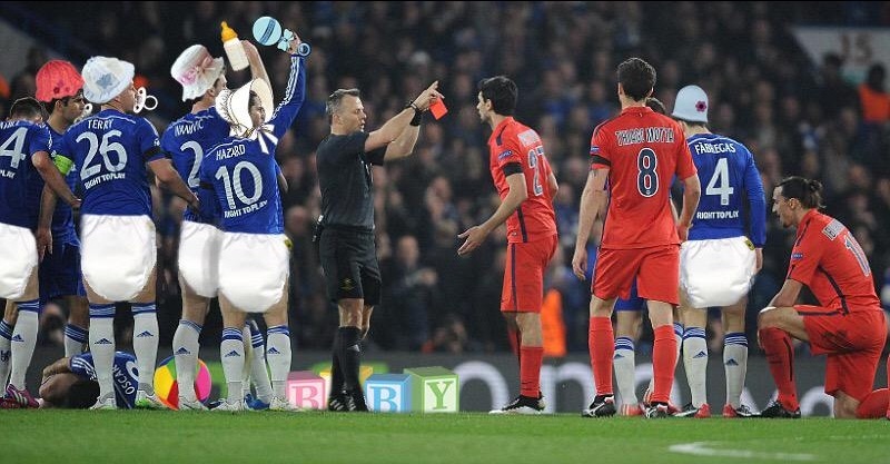 | Sau khi Zlatan Ibrahimovic phạm lỗi với Oscar trong trận lượt về vòng 1/8 Champions League, 9 cầu thủ Chelsea lao về phía trọng tài để phản ứng. Hành động của các ngôi sao The Blues bị chân sút người Thụy Điển xem như trẻ con. |