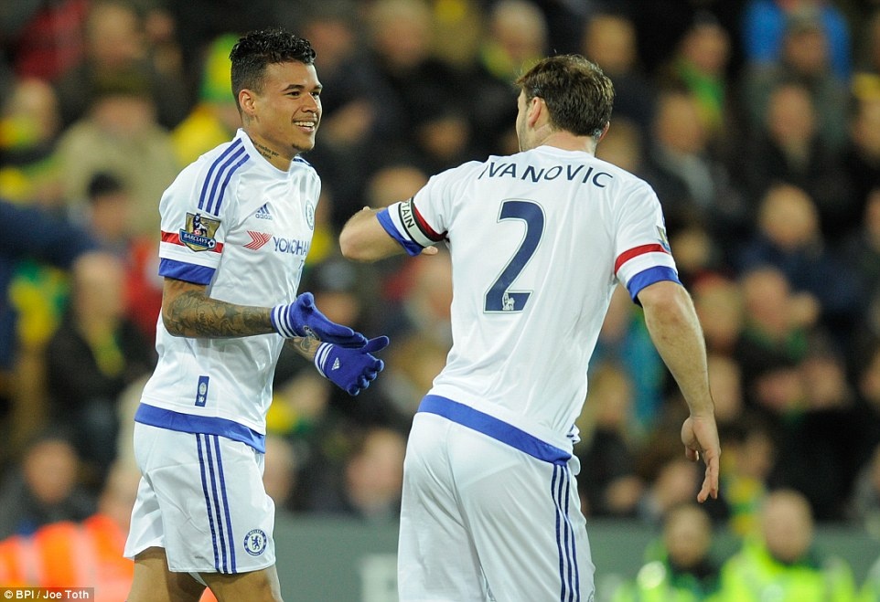 | Thủ quân Ivanovic chúc mừng cầu thủ trẻ Kenedy sau khi làm tung lưới Norwich. |