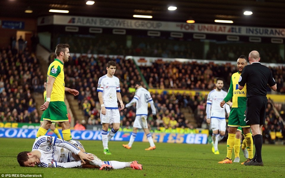 | Sau đó, trận đấu diễn ra khá căng thẳng. Tiền vệ Hazard của Chelsea nằm sân do bị đau từ tình huống va chạm với cầu thủ chủ nhà Norwich. |