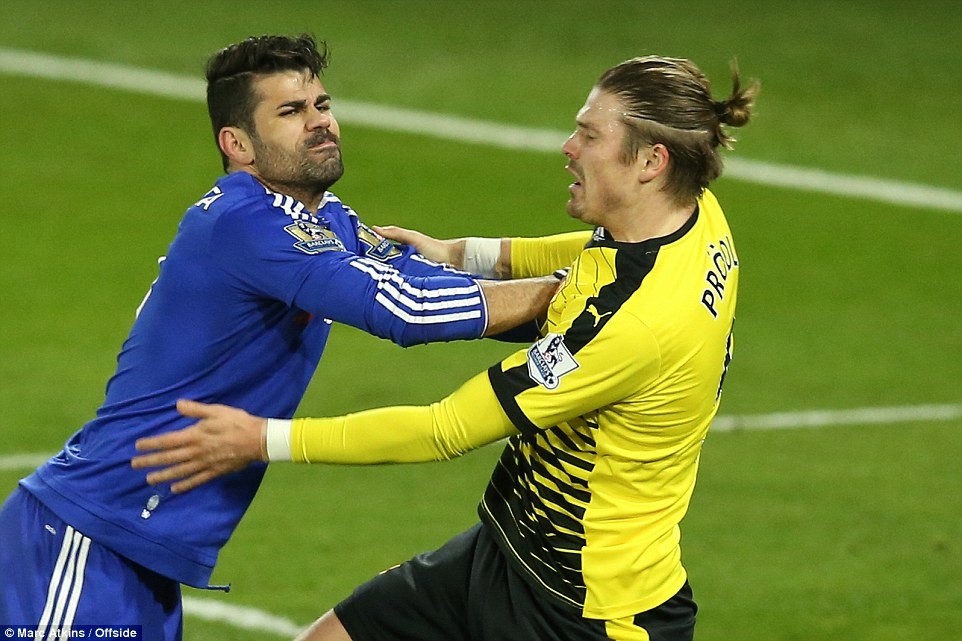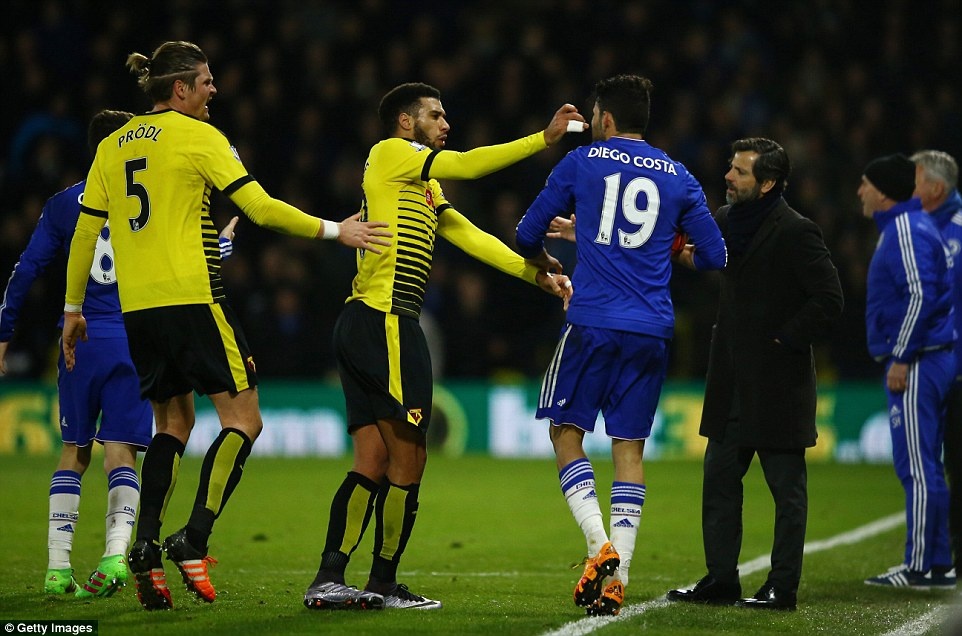 Tâm điểm trên sân vẫn là những vụ va chạm của tiền đạo Diego Costa với cầu thủ chủ nhà Watford. Anh có tình huống đẩy Prodle đầu hiệp 1.