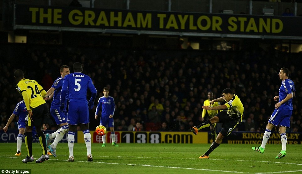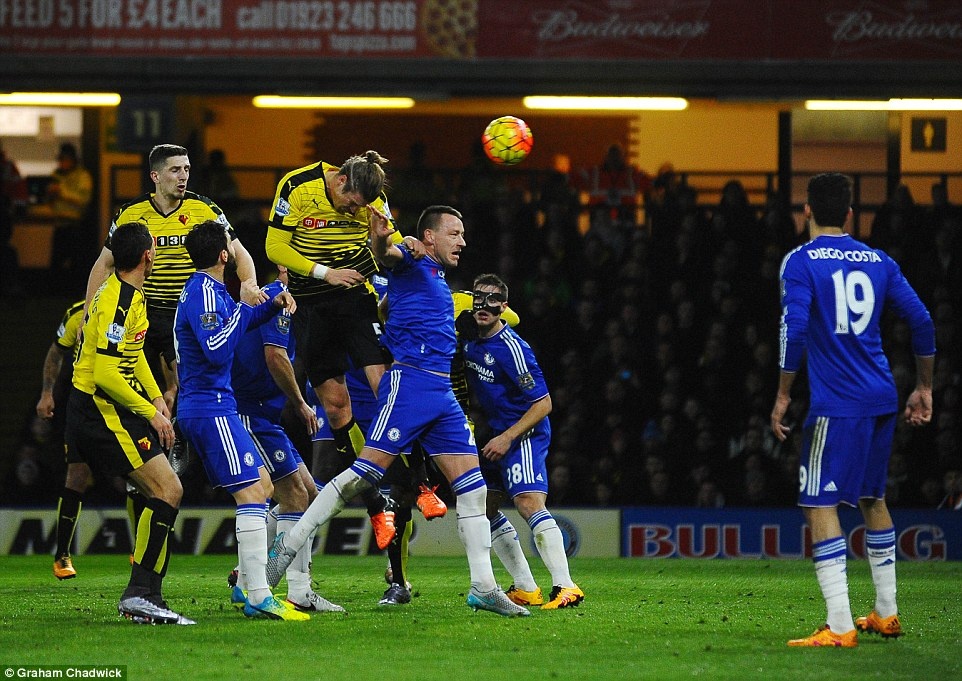 Bên phía đội chủ nhà, tiền đạo Troy Deeney tung cú volley nhưng lại không thể vượt qua được hậu vệ Chelsea.