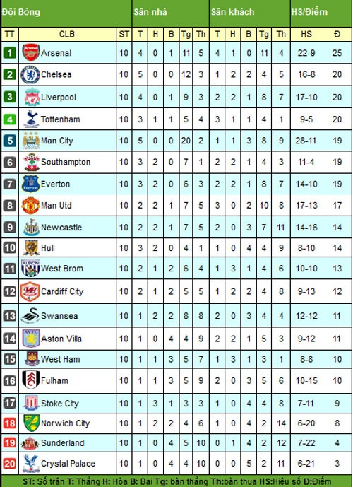 Vị trí của Chelsea và West Brom trên bảng xếp hạng trước vòng 11