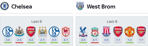 Thành tích thi đấu của Chelsea và West Brom trong 6 trận gần đây
