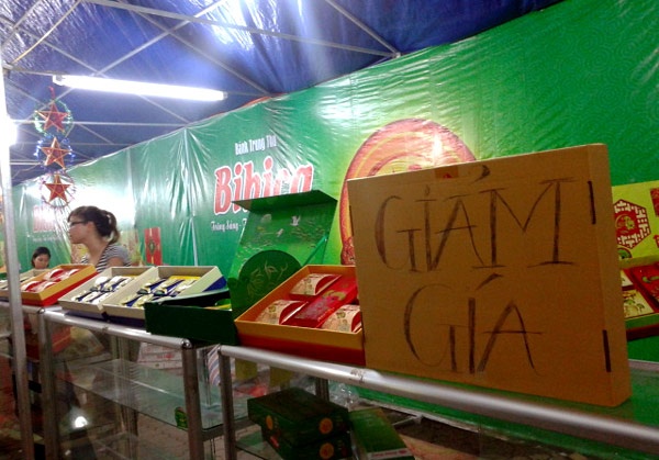 Người dân Hà Nội lại chen nhau mua bánh trung thu khi nhiều cửa hàng bán bánh của các nhãn hiệu lớn đêm qua (rằm tháng 8) trưng biển đại hạ giá thu hồi vốn, có nơi thậm chí đổ đống bánh ra đường bán rẻ.