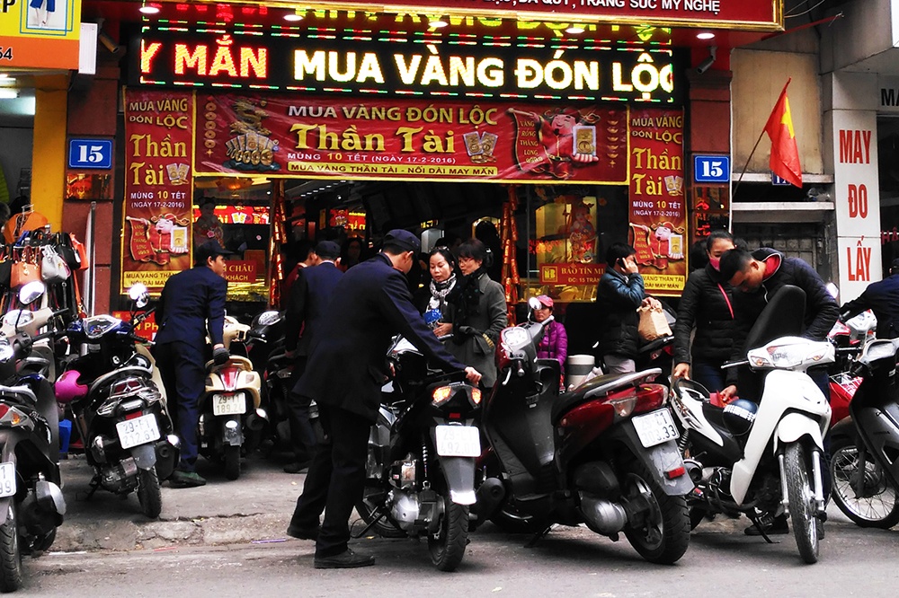 Theo khảo sát của Zing.vn, trưa 15/2, cảnh mua bán diễn ra tấp nập tại các cửa hàng trên "phố vàng" Trần Nhân Tông (quận Hoàn Kiếm, Hà Nội). Tại các tuyến phố khác tại Hà Nội tập trung nhiều cửa hàng kinh doanh vàng bạc như Hà Trung, Cầu Giấy, Tôn Đức Thắng, Khâm Thiên... lượng người giao dịch ở những điểm bán vàng cũng tăng so với ngày thường.