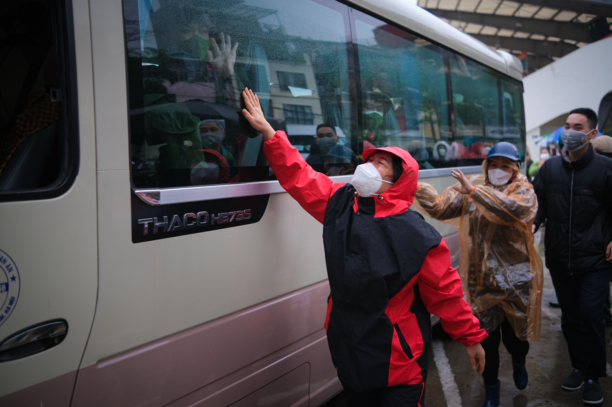 Sáng 16/2, 30 quận, huyện, thị xã của thủ đô tổ chức giao nhận quân năm 2022. Năm nay, Hà Nội có 897 thanh niên viết đơn tình nguyện đi nghĩa vụ quân sự và công an. Khi đoàn xe chuyển bánh, nhiều người thân chạy theo để chào tạm biệt các tân binh. Ảnh: Phạm Thắng.